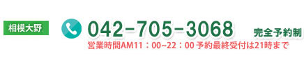 相模大野駅から徒歩3分の場所にあります。ご予約は21時まで可能。月曜日から土曜日までと祭日も営業しております。お仕事帰りにお立ち寄りいただく方も多いです。